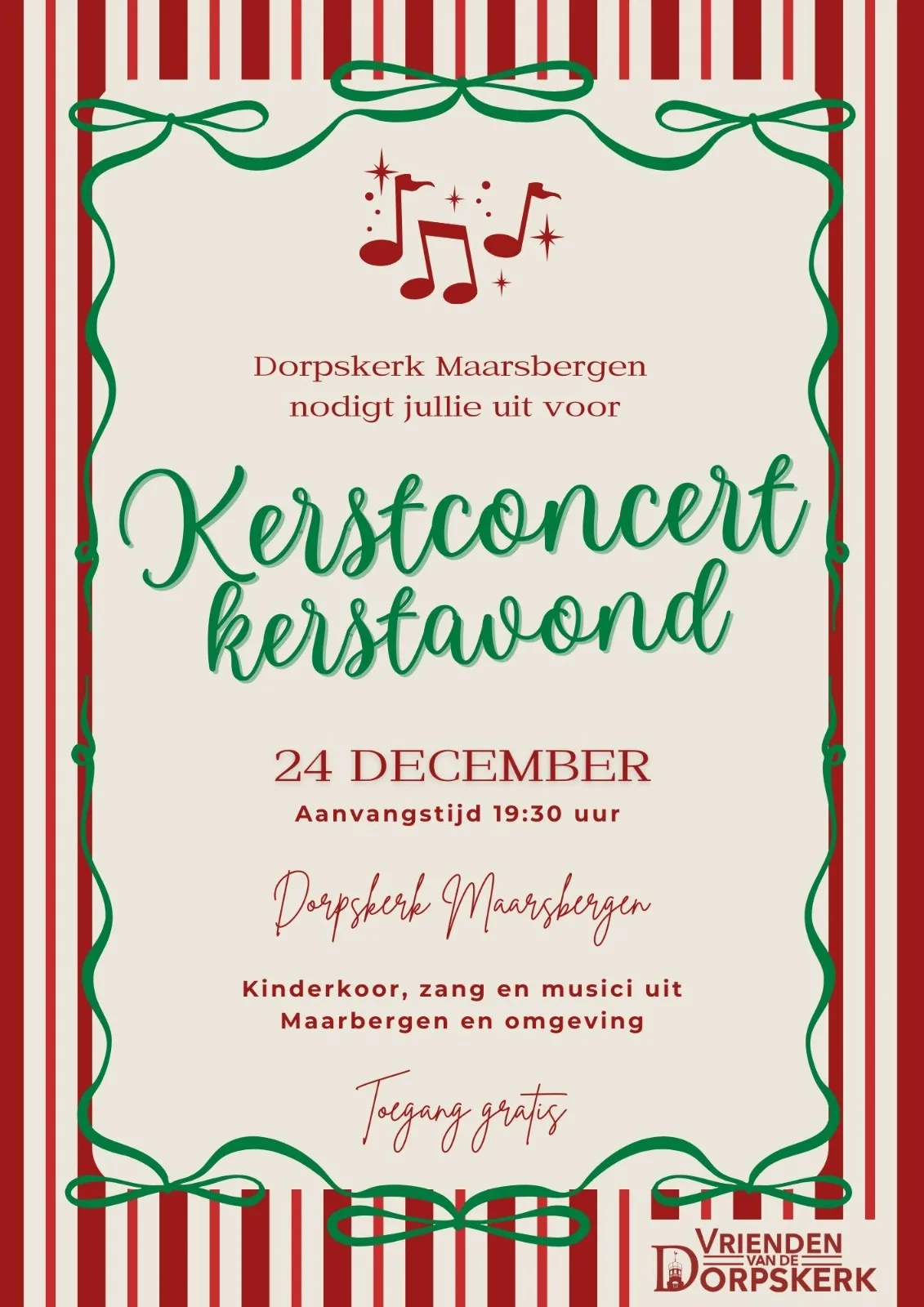 Kinderkoor, zang en musici uit Maarsbergen e.o. geven op Kerstavond een kerstconcert in de Dorpskerk. Aanvang 19.30 uur U bent van harte welkom, toegang is gratis
